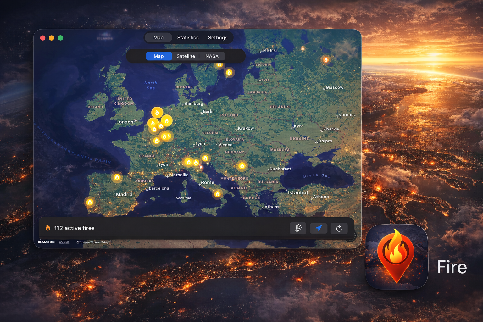 Fire uses NASA satellite data to detect wildfires. Data is typically available within 3 hours of observation. This app is for informational purposes only.